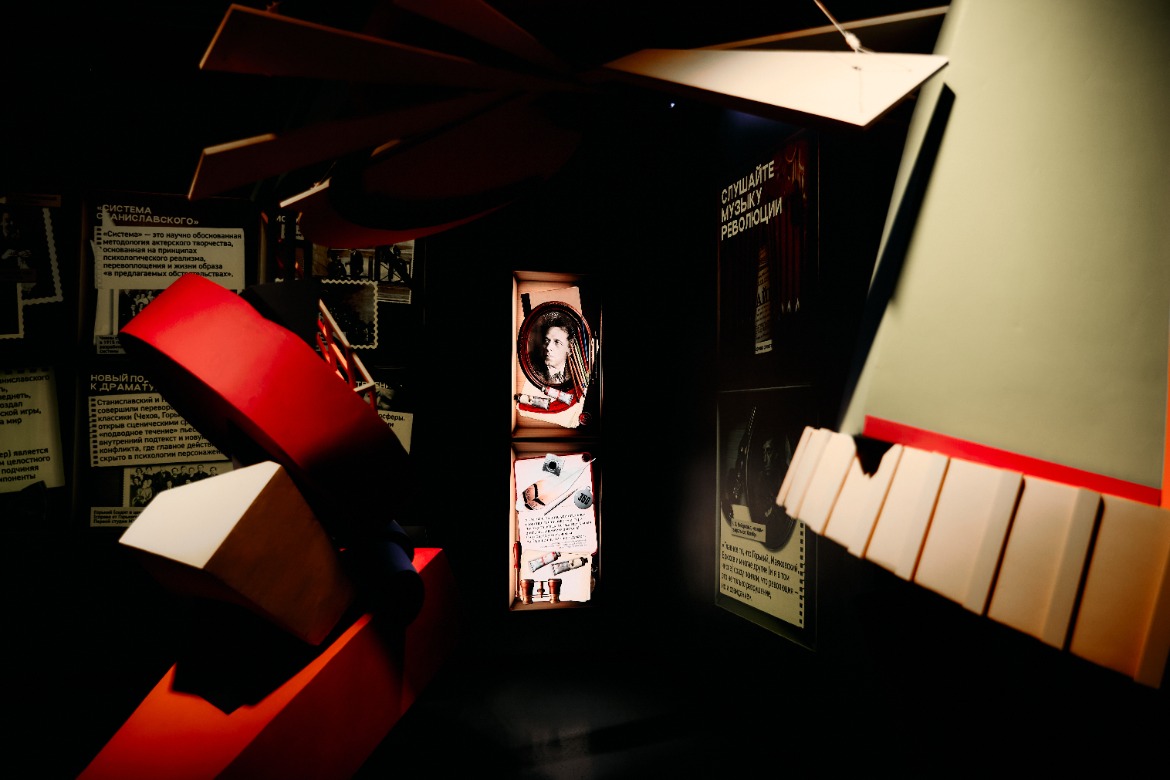 На мультимедийных стенах экспозиции оживают портреты участников первого Всероссийского съезда сценических деятелей. Сенсорные экраны и виртуальные книги знакомят с эскизами костюмов Мейерхольда и редкими фактами о театре XIX века. В интерактивной игре можно попробовать себя в механике сценического движения, а в иммерсивном Зеркальном зале — оказаться внутри калейдоскопа декораций Бакста, Коровина и Рериха. Также гости могут попробовать создать театральные эффекты сами — с помощью гром-машины и ветро-машины.